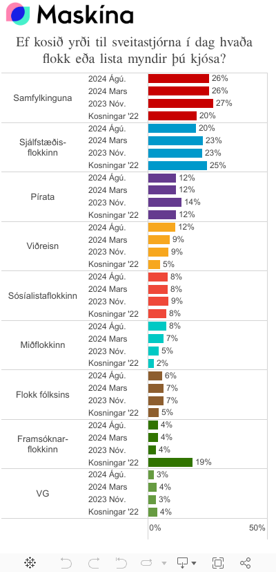 Nýr Borgarviti Maskínu hefur litið dagsins ljós en í honum er púlsinn tekinn á borgarbúum um ýmislegt sem snýr að borgarstjórn. Mestu breytingar í fylgi flokkanna er að sjá á fylgi Sjálfstæðisflokksins sem tapar 3 prósentustigum frá síðustu mælingu í mars og fylgi Viðreisnar sem bætir við sig 3 prósentustigum.