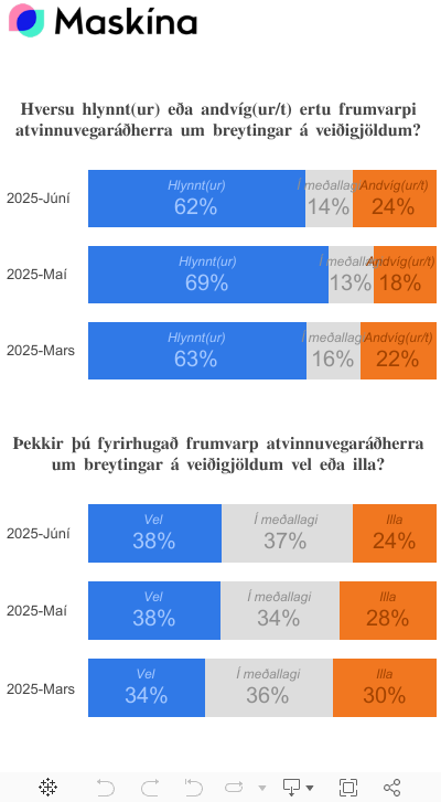 Maskína hefur nú lagt fyrir í þriðja sinn spurningar um viðhorf almennings til frumvarps atvinnuvegaráðaherra um breytingar á veiðigjöldum. Niðurstöðurnar sýna að nokkuð fækkar í þeim hópi sem segist hlynntur breytingunum eða um 7 prósentustig frá Maskínukönnun í maí. En þá sögðust 69% aðspurðra hlynntir breytingunum en nú eru það 62% sem segjast hlynntir. Sömuleiðis fjölgar þeim sem eru andvígir breytingunum sem voru 18% í maí en eru nú 24%