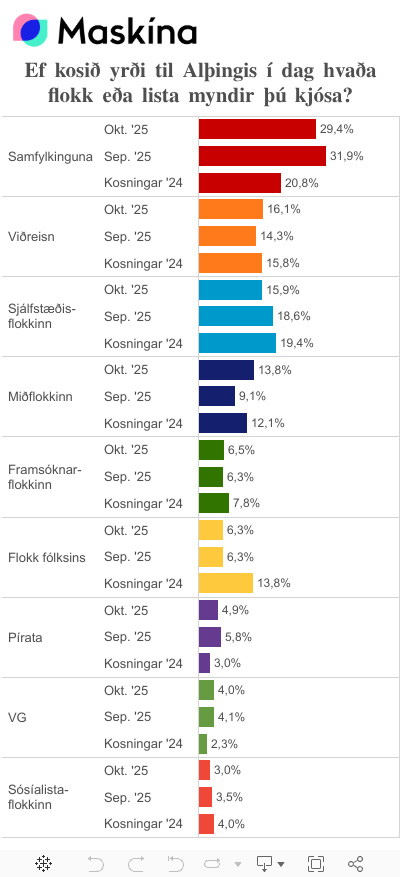 Í mánaðarlegri fylgismælingu Maskínu á fylgi flokkanna má sjá nokkur tíðindi en þar hefur Miðflokkurinn bætt við sig 5 prósentustigum frá mælingu síðasta mánaðar. Þá er fylgi Viðreisnar og Sjálfstæðisflokks svo gott sem hnífjafnt, en ekki mælist marktækur munur á Viðreisn, Sjálfstæðisflokki og Miðflokki. Þá gefur fylgi Samfylkingar örlítið eftir eða um 2 prósentustig á milli mánaða, það er