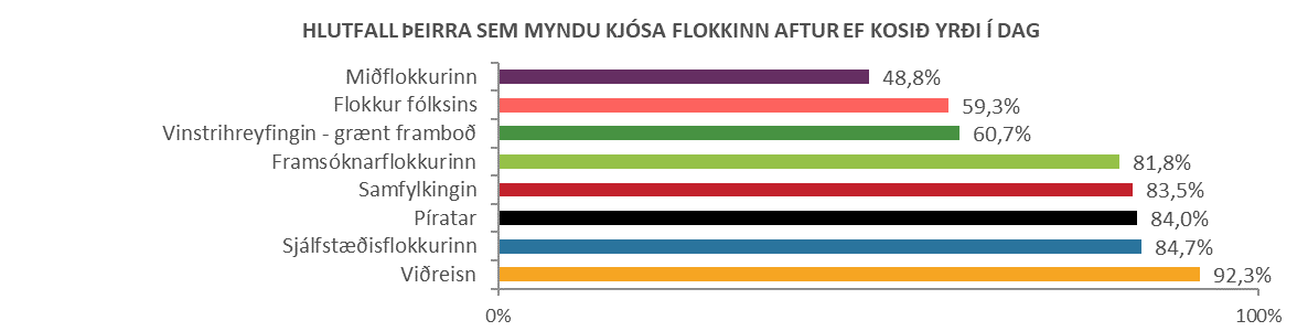 Maskína spurði hvaða flokk fólk myndi kjósa í dag og hvaða flokk það kaus í síðustu kosningum. Þetta er forvitnilegt í ljósi umræðna sex þingmanna á Klaustri í lok nóvember. Innan við helmingur þeirra sem segjast hafa kosið Miðflokkinn í síðustu kosningum ætlar að kjósa hann aftur nú, eða tæplega 49%. Rúmlega 59% þeirra sem kusu Flokk fólksins í síðustu kosningum myndu kjósa hann aftur nú. En nokkra athygli vekur að næstum sama hlutfall eða tæplega 61% þeirra sem kusu Vinstrihreyfinguna – grænt framboð síðast myndi kjósa flokkinn aftur nú, en ekki þarf að taka fram að enginn þingmaður þess flokks var á Klaustri umrætt kvöld. Hæst hlutfall kjósenda Viðreisnar myndi kjósa flokkinn aftur nú, eða rúmlega 92% en 82-85% kjósenda hinna flokkanna, Framsóknarflokks, Samfylkingar, Pírata og Sjálfstæðisflokksins.