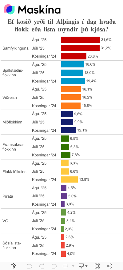 Í hverjum mánuði birtir Maskína fylgi flokkanna á landsvísu og núna eru niðurstöður ágústmánaðar komnar í loftið. Þær niðurstöður sýna nánast algjörlega óbreytta stöðu frá júlí mánuði þar sem Samfylkingin er langstærst og mælist með tæplega 32% fylgi. Næststærsti flokkurinn er Sjálfstæðisflokkur með tæplega 19% og fast á hæla þeirra flokkur utanríkisráðherra, Viðreisn, með 16%.