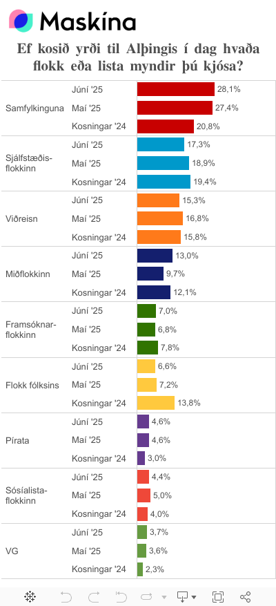 Samfylkingin er sem áður stærsti flokkurinn samkvæmt niðurstöðum könnunarinnar með um 28% fylgi og bætir lítillega við sig á milli mánaða. Það er ríflega 7 prósentustigum meira en flokkurinn hlaut í síðustu kosningum. Sjálfstæðisflokkurinn, sem er næst stærstur, er með rúmlega 17% fylgi sem er nokkru minna en í maí mánuði þegar fylgi hans nam tæplega 19%. Fylgi Viðreisnar helst áfram stöðugt um 15% sem er sambærilegt kjörfylgi flokksins.