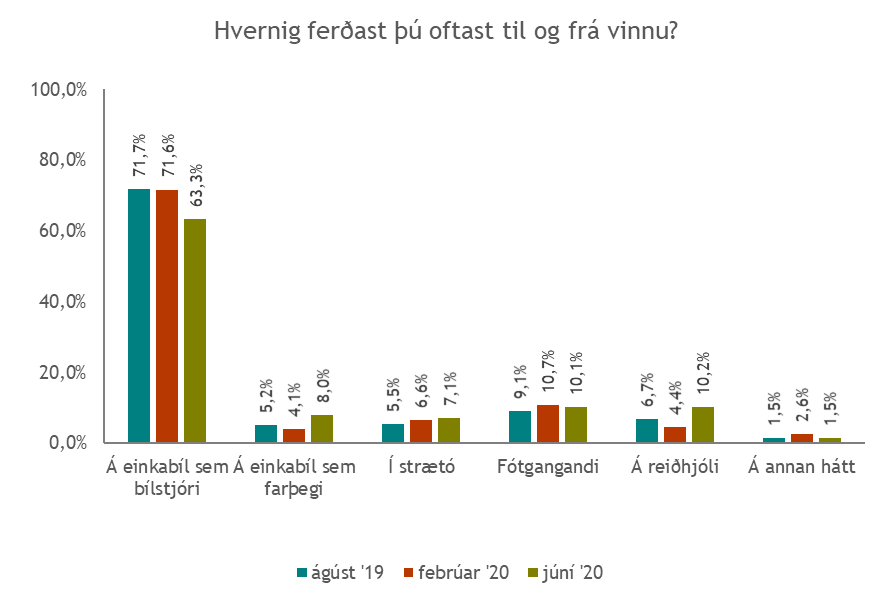Maskína hefur síðastliðið ár spurt höfuðborgarbúa hvernig þeir ferðist til og frá vinnu og hvernig þeir væru helst til í að ferðast þá leið. Alls hefur Maskína lagt þessar spurningar fyrir þrisvar sinnum. Fyrst í ágúst 2019, næst í febrúar 2020 og að lokum núna í júní síðastliðnum.
